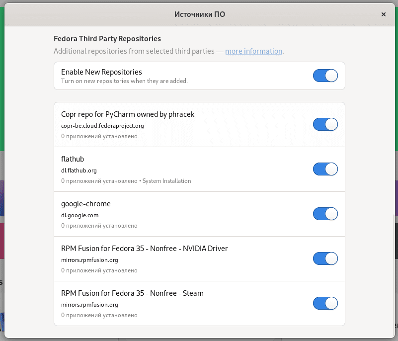 Теперь, при включении сторонних репозиториев «Third-party Software Repositories», они сразу становятся активны. Сторонние репозитории доступны в пакете fedora-workstation-repositories, который теперь предустановлен в системе.