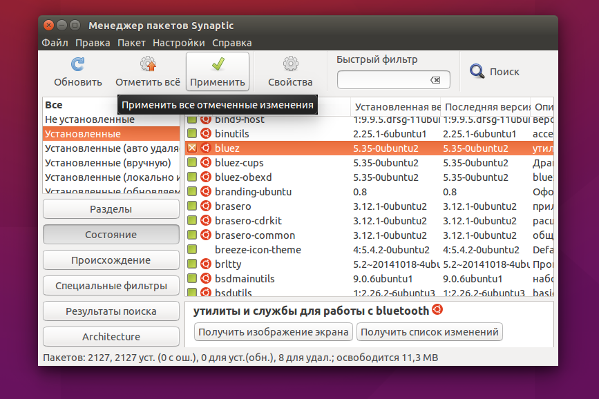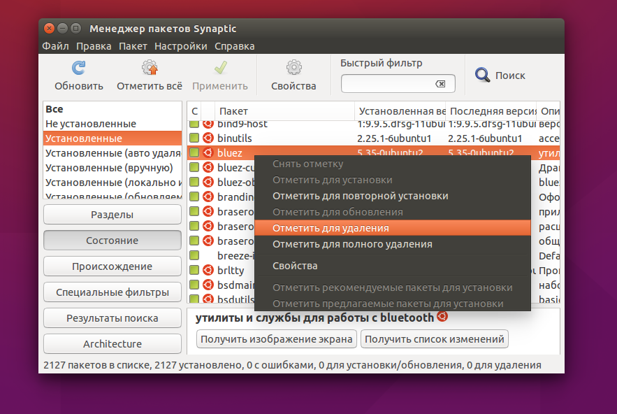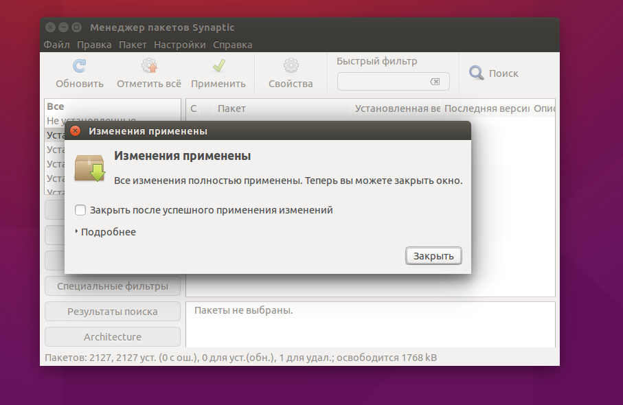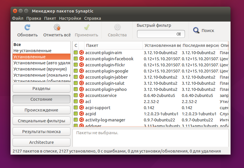 Дальше рассмотрим пакетный менеджер Synaptic. Это как ни как стороннее программное обеспечение, но многие его используют из-за большого функционала и удобного интерфейса. Если программа еще не установлена, ее нужно установить с помощью центра приложений или выполнив в терминале: