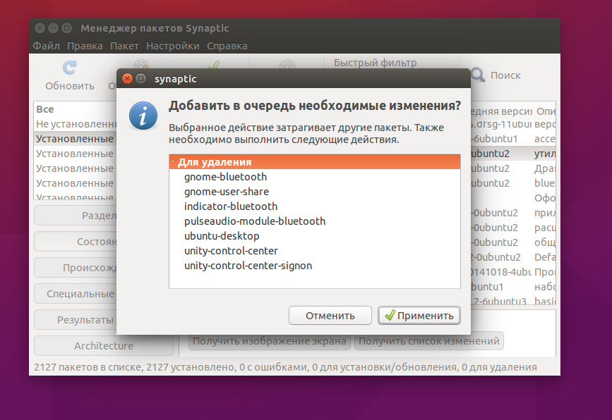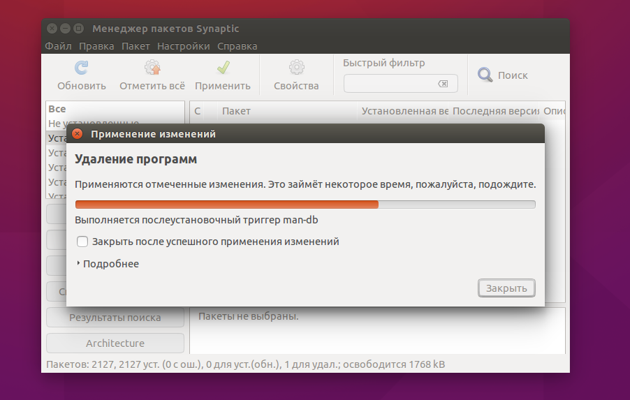 Программа покажет, какие еще пакеты будут удалены, это те пакеты, которые зависят от нашего пакета: