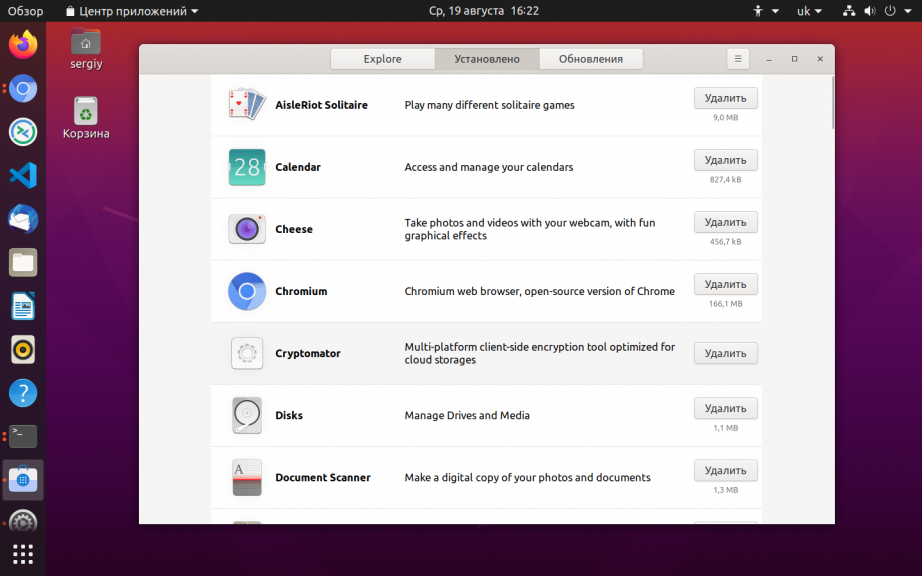 Список всех установленных пакетов находится на вкладке Установлено, здесь приложения рассортированы по категориям: