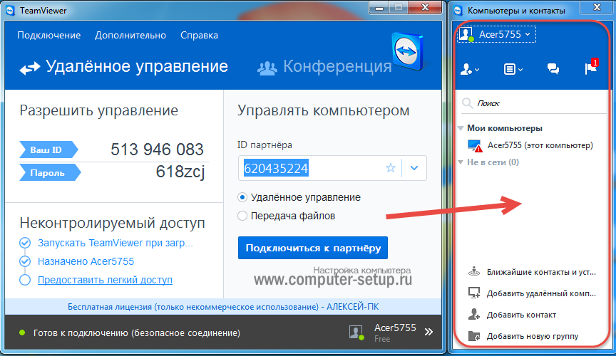 Для того что бы иметь возможность постоянно заходить или управлять своим компьютером необходимо добавить его к себе в контакты и настроить неконтролируемый доступ. Для этого, на управляемом компьютере, открываем меню Подключение и выбираем Настроить неконтролируемый доступ…