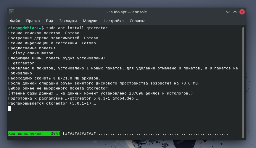 При установке или удалении пакета с помощью команды apt, отображается шкала прогресса, показывающая в процентах ход выполнения текущей задачи:
