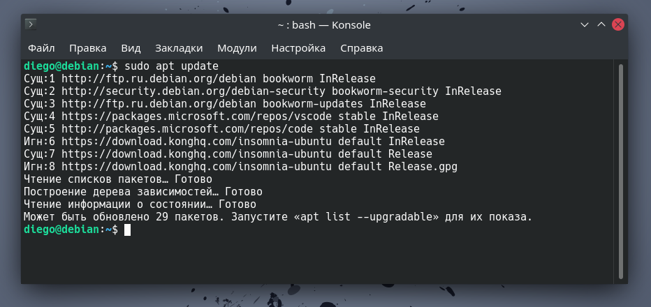 Когда в репозиторий вносятся изменения, например, при обновлении пакета, необходимо синхронизировать эту информацию с локальным кэшем вашей операционной системы Linux. Это делается командой: