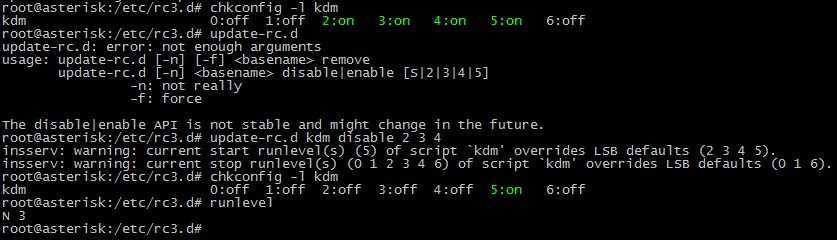 update-rc.d — служит для запуска/остановки скриптов, при старте/выключении системы. Собственно через нее мы и будем менять автозапуск графической оболочки KDE(kdm). Так уж получилось, что у меня запуск окружения KDE включен для 2-5 уровней по умолчанию.