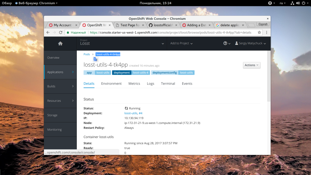 Нас интересует запущенный контейнер, running. Теперь можно подключиться к нему по ssh с помощью oc: