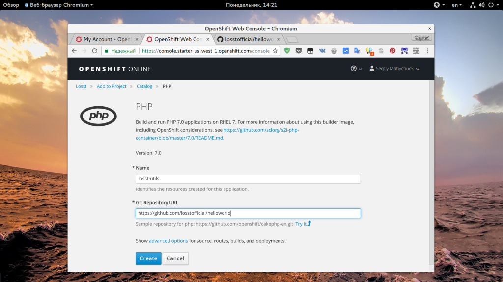 Последний шаг, вам нужно выбрать имя для нового проекта и указать репозиторий Git, на котором находится его код.