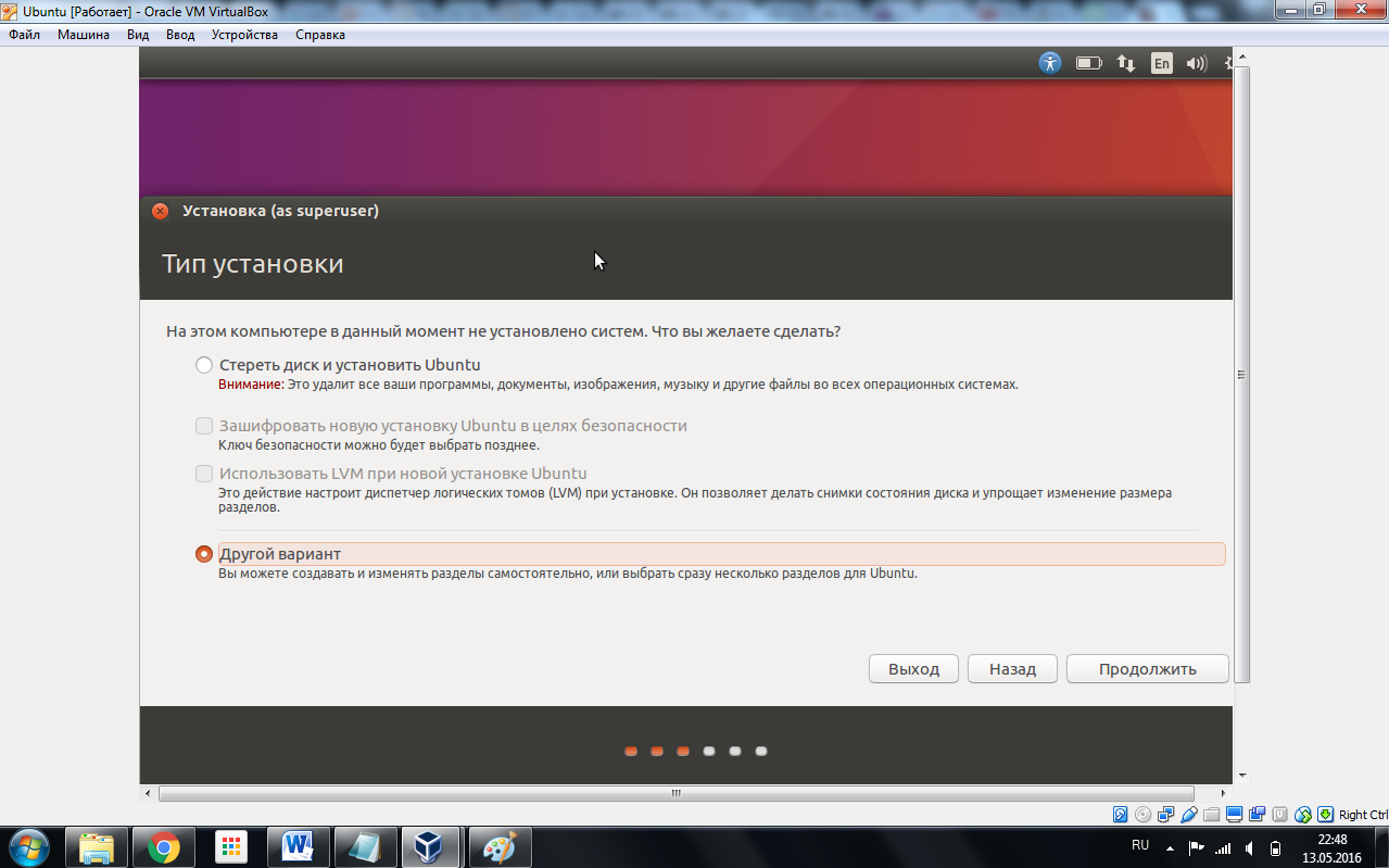 Можно просто отформатировать весь винчестер и установить на него Ubuntu, но мной будет рассмотрен ручной вариант, поэтому я устанавливаю переключатель в положение «Другой вариант» и жму кнопку «Продолжить»