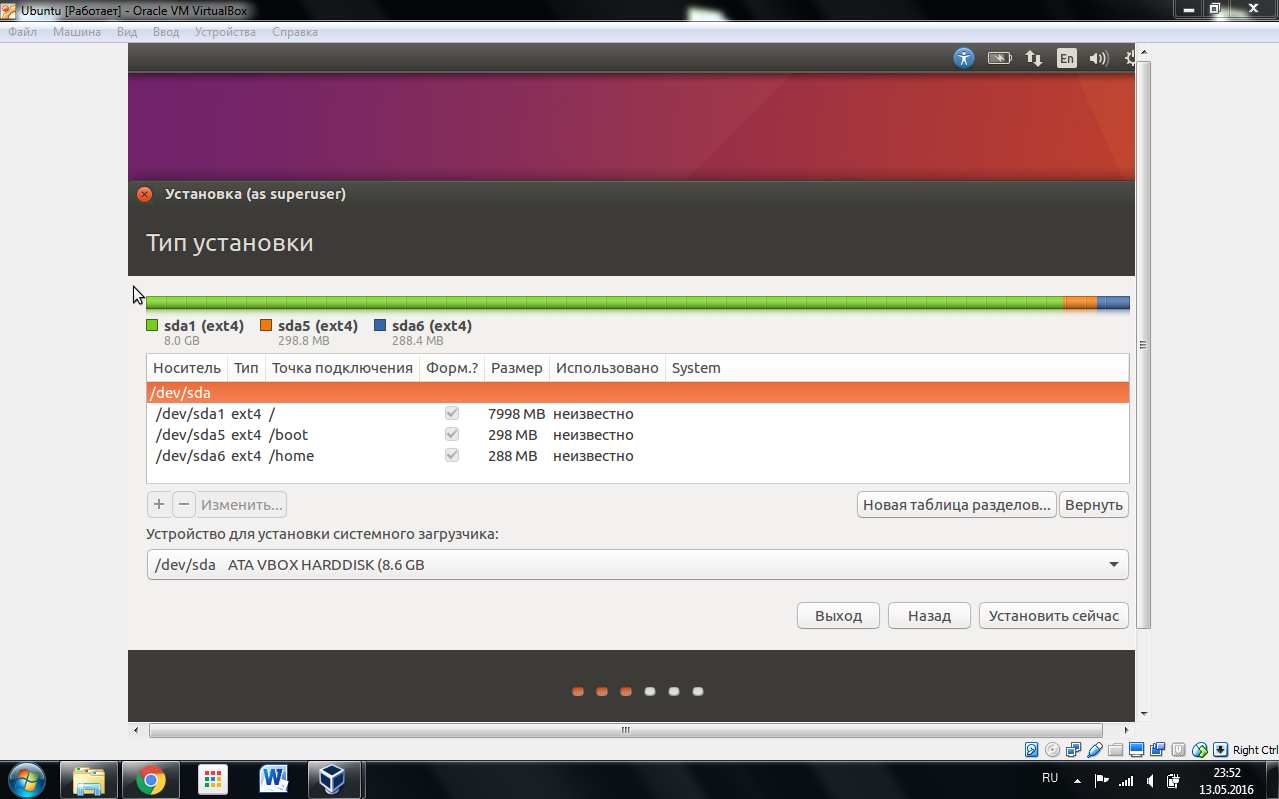 После этого происходит установка Ubuntu. Дожидаюсь её завершения.