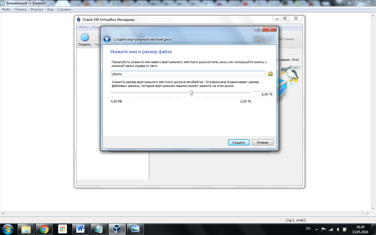 Имя я задам «Ubuntu», а размер оставлю по умолчанию 8,00 Гб.