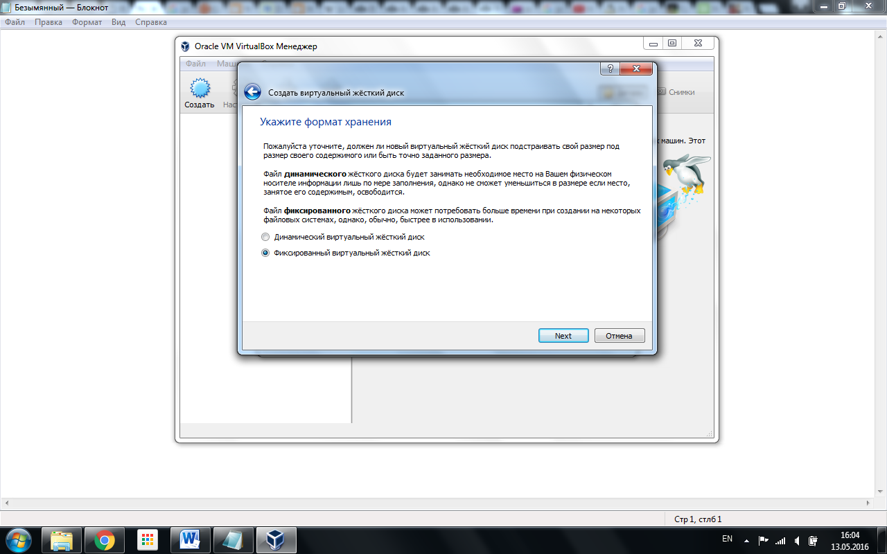 Виртуальный жесткий диск может быть создан либо динамическим, либо фиксированным. Динамический диск создается не на весь задаваемый настройкой объем, а на его часть, и увеличивается по мере необходимости в процессе работы виртуальной машины. Для получения максимального быстродействия гостевой операционной системы лучше выбрать фиксированный виртуальный жесткий диск, а для экономии дискового пространства — динамический.