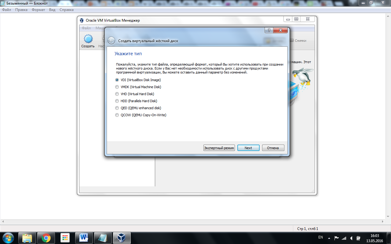 Тип файла, определяющий формат, желаемый использовать при создании нового жесткого диска, я оставлю без изменений VDI.