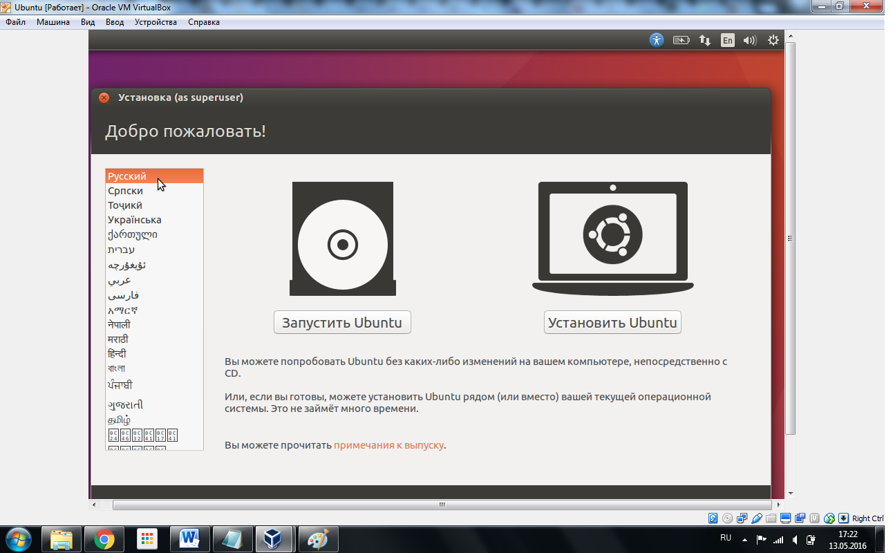 Далее на экране появляется окно приветствия, где нужно выбрать язык. Почти все дальнейший действия будут переведены на него. Кроме того, на этом этапе предоставляется выбор «Запустить» или «Установить» Ubuntu.