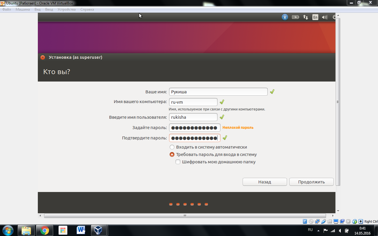 Затем выбираю часовой пояс, место нахождения, ввожу имя пользователя, имя компьютера и пароль