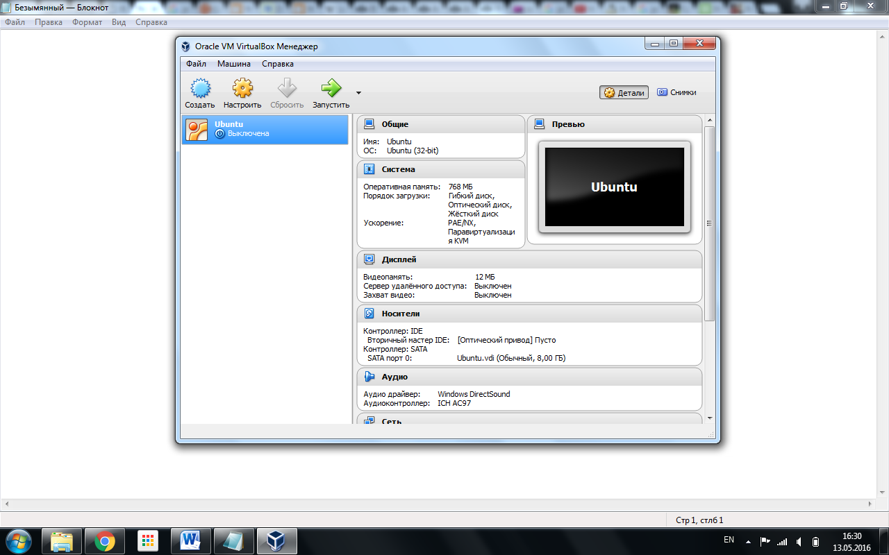 В настройках в пункте «Носители» выбираю образ оптического диска «ubuntu-16.04-desktop-i386», нажимаю «Ок» и запускаю виртуальную машину.
