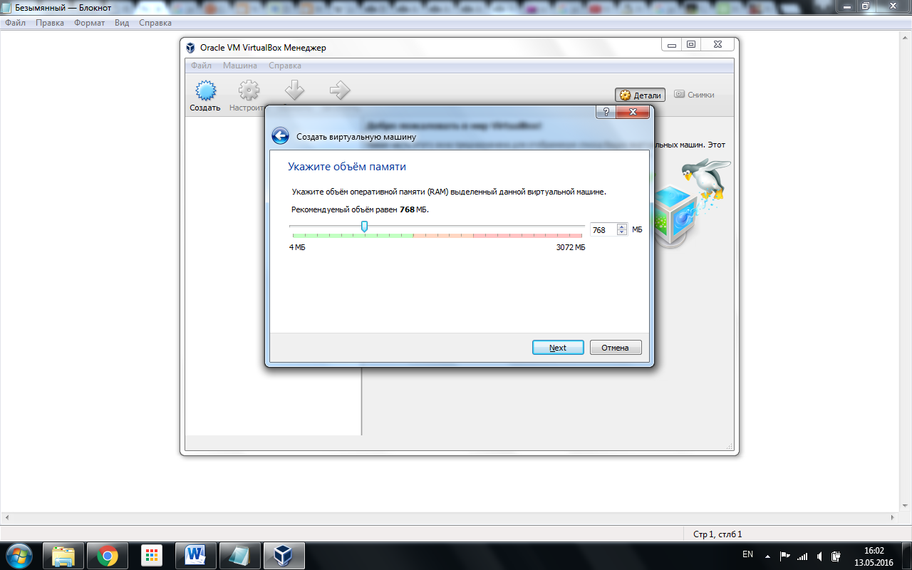 При выделении памяти, нужно учитывать реальный ее объем и минимальные требования гостевой ОС. Если возникают затруднения в выборе данного пункта — используйте рекомендуемые программой значения. Неправильное распределение памяти между реальной и виртуальной машинами может привести к снижению производительности обеих.