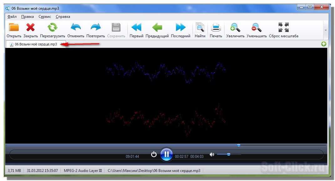 Открываем файл формата mp3. Также курсором перетаскиваем файл в окно программы, или же нажимаем на папку открыть и выбираем нужный нам формат файла.