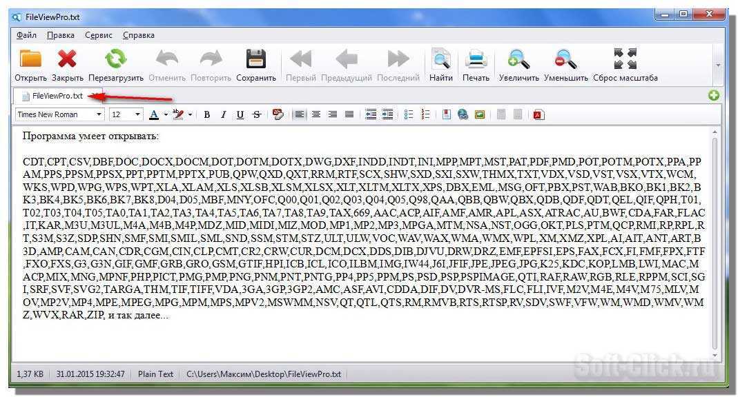Далее, таким же способом закидываем текстовый файл, в этом текстовом файле вы видите все типы файлов которые открываются в данной программе, как видите количество немалое.