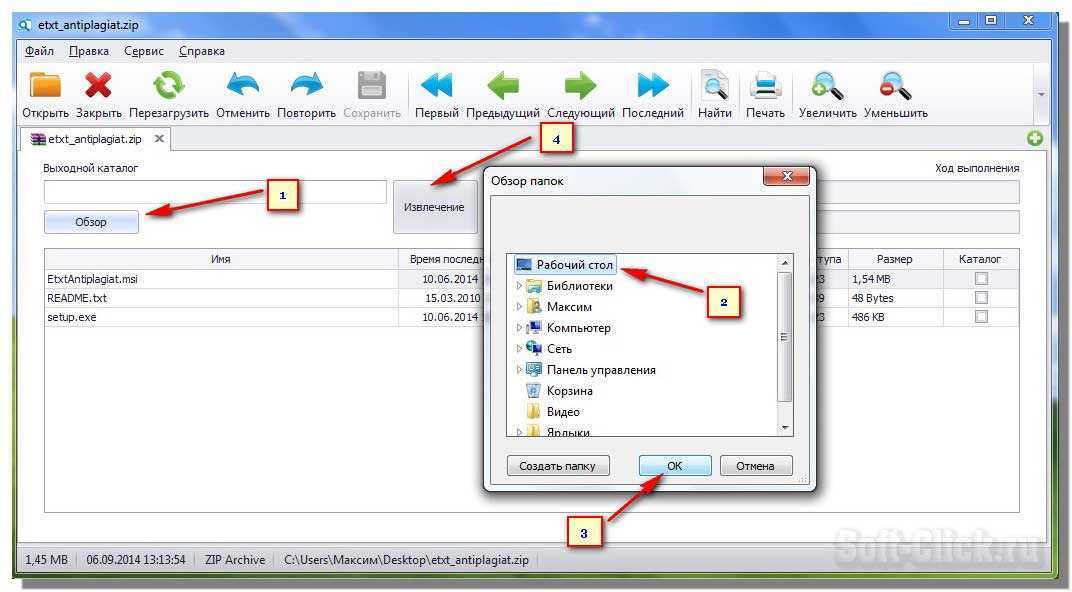 Теперь попробуем разархивировать zip-архив с файлами, таким же образом закидываем архив в окно программы, выбираем обзор, указываем куда извлечь файлы из архива и нажимаем кнопку извлечение. Начнётся процесс извлечения файлов из архива.