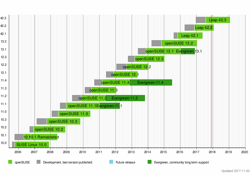 Начиная с версии Leap 42.1 (после версии 13.2) ожидается, что каждый основной выпуск будет поддерживаться не менее 36 месяцев, пока не будет доступна следующая основная версия (например, 42.1, 15.0), согласованная с выпусками SUSE Linux Enterprise. Ожидается, что каждый второстепенный выпуск (например, 42.1, 42.2 и т. Д.) Будет выпускаться ежегодно в соответствии с пакетами обновления SUSE Linux Enterprise, и ожидается, что пользователи обновятся до последнего второстепенного выпуска в течение 6 месяцев с момента его доступности, что приведет к ожидаемой поддержке жизненный цикл тоже 18 месяцев. Tumbleweed обновляется на постоянной основе и не требует обновлений, кроме обычной установки небольших обновлений и снимков.