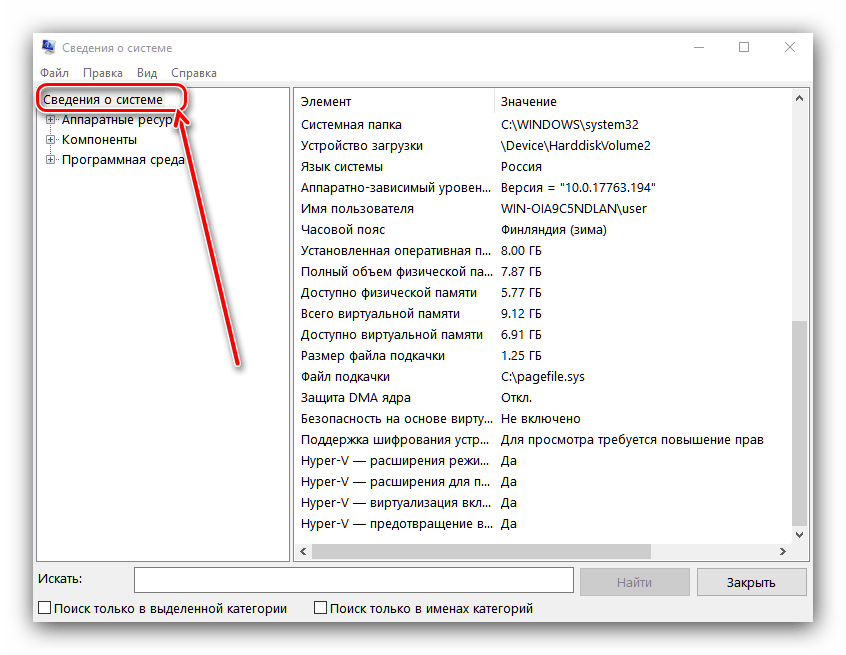 Запустится средство «Сведения о системе». Перейдите к разделу с таким же названием с помощью меню слева.