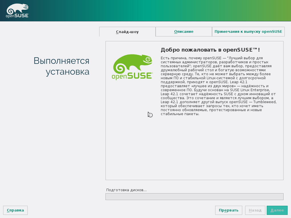Установщик OpenSUSE основан на YaST и выглядит очень красиво. Он имеет привычную нам пошаговую структуру и позволяет сделать все то же самое что и установщик Fedora. Но здесь намного больше настроек.