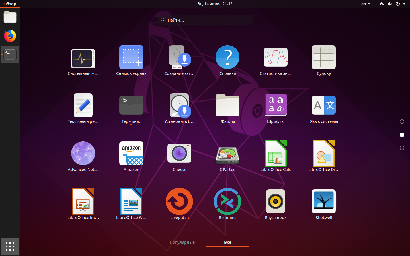 Что на мой взгляд в Ubuntu не очень, так это то, что нет меню с программами в привычном виде. Вместо него открывается нечто универсальное с полем поиска на первом плане. Здесь по умолчанию выводятся программы, фото и документы, которые вы недавно открывали на компьютере. Чтобы отыскать другие установленные программы нужно вначале выполнить какие-нибудь телодвижения, типа развернуть скрытое поле, или написать название в поиске.