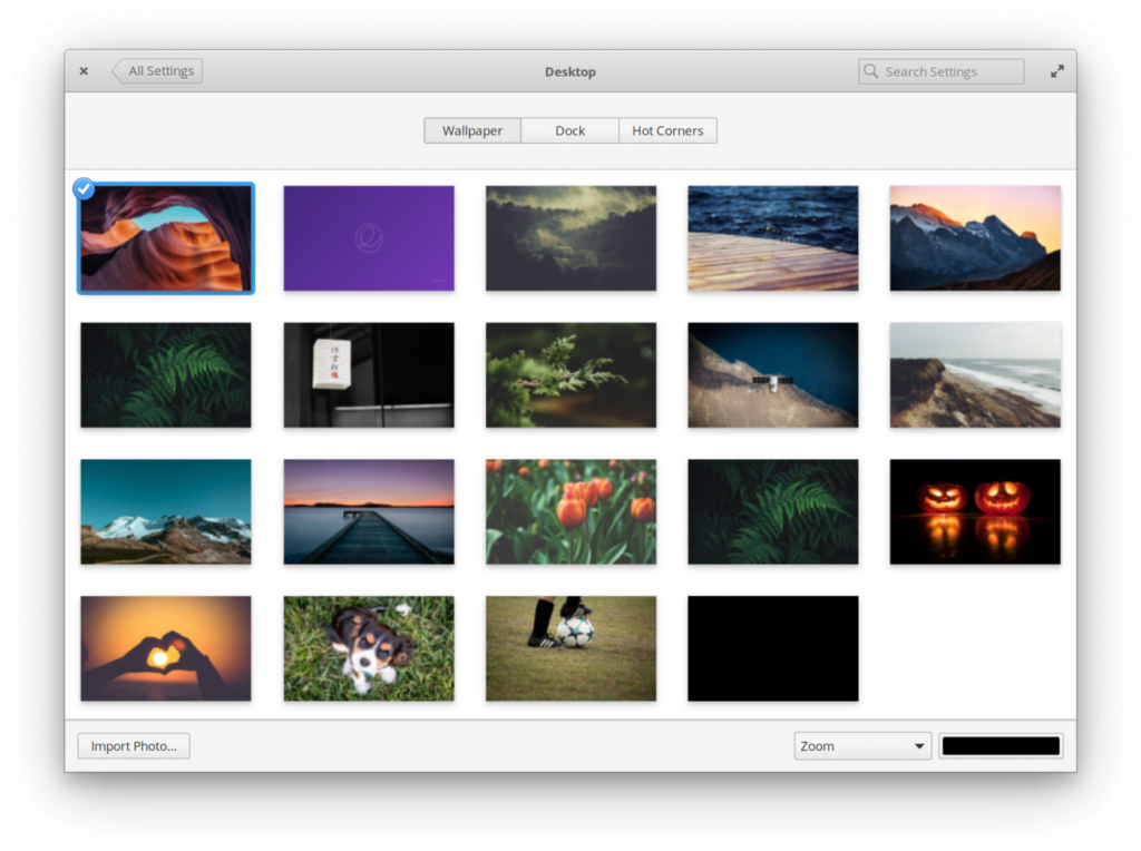 Рабочий стол Pantheon очень простой и на нем несложно разобраться. Он состоит из двух основных элементов — панели и док-бара с иконками запуска приложений. По умолчанию, вы не можете создавать ярлыки на рабочем столе и выполнять клик правой кнопкой мышки. Для того чтобы сменить фоновый рисунок вам придется открыть «Настройки системы» -> «Рабочий стол» -> «Фоновый рисунок».