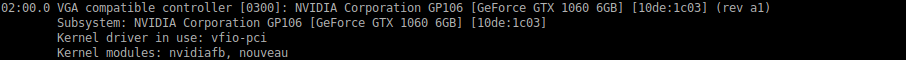 В строке Kernel driver in use должно быть vfio-pci. Это означает, что видеокарта была успешно захвачена драйвером vfio_pci.