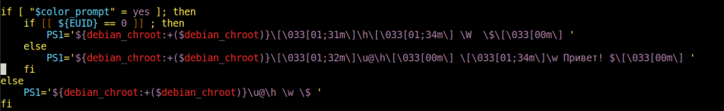 В этом файле вы должны увидеть несколько различных настроек. Некоторые из них в данный момент неактивны и представляют собой обычные комментарии — строки синего или сине-зеленого цвета, отмеченные знаком . Строки белого цвета используются оболочкой для настройки её поведения.