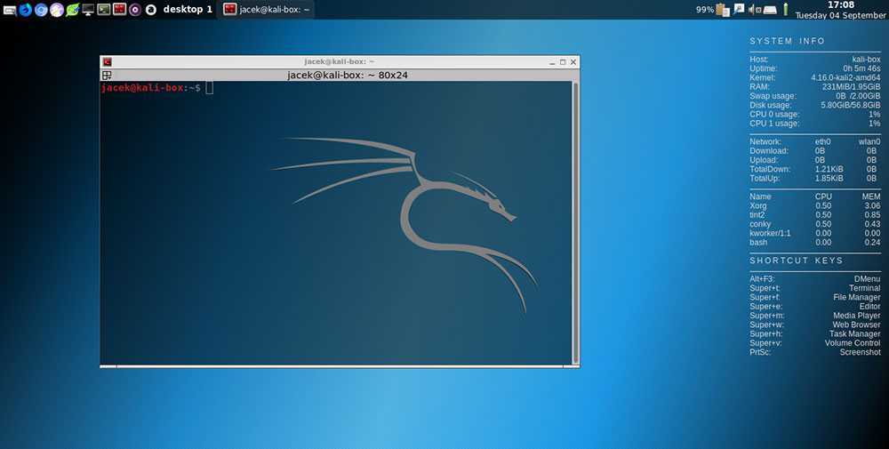 Следующий дистрибутив Kali весьма специфичен и многие его называют хакерским. Если кто-то из вас слышал о root-доступе, то вот именно в этой ОС он предоставлен по умолчанию. Если графическая оболочка не нужна, а важен, в первую очередь, результат при решении задач, связанных с безопасностью – то это ваш выбор.