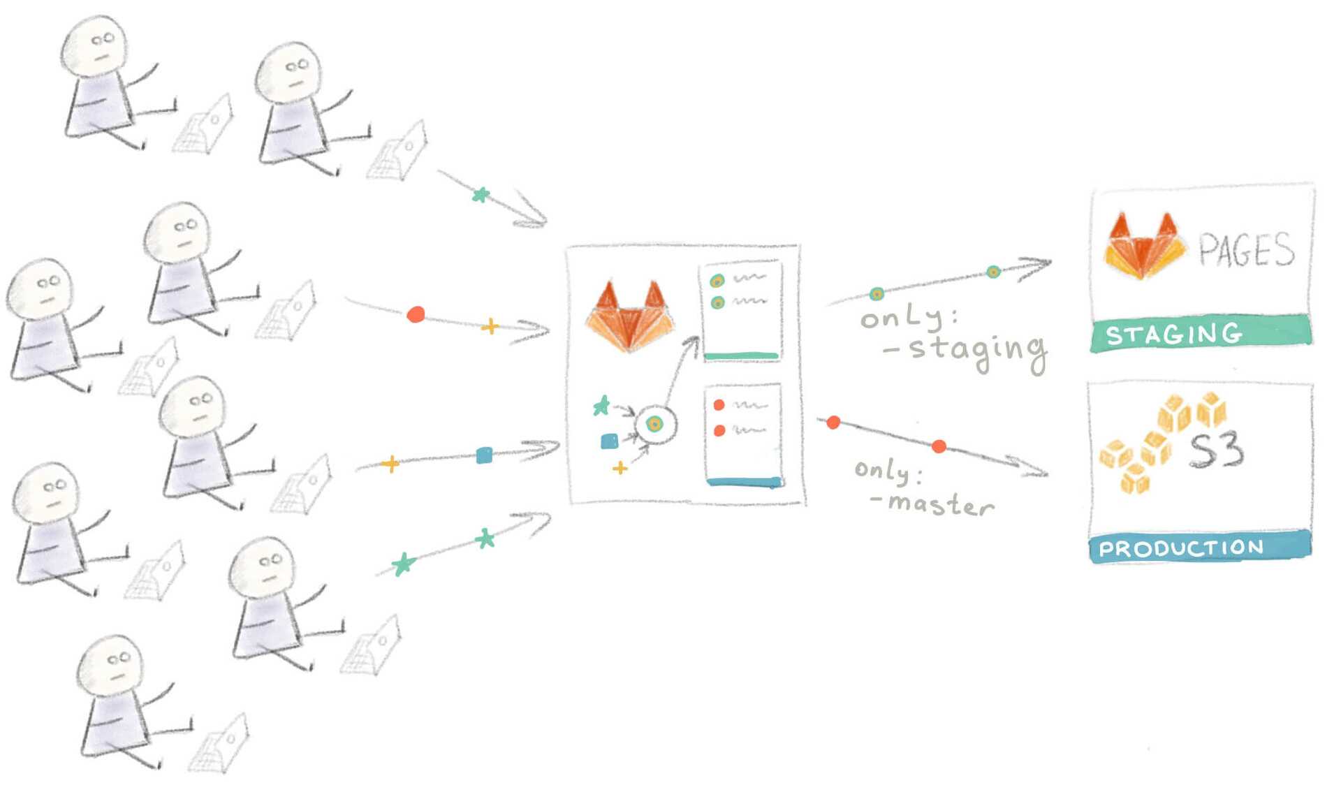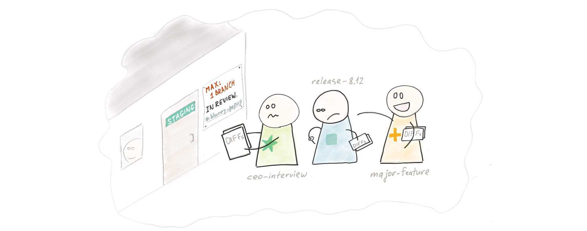 Со временем ваш сайт стал очень популярным, а ваша команда выросла с двух до восьми человек. Разработка происходит параллельно, и людям все чаще приходится ждать в очереди для превью на Staging. Подход “Проводите развертывание каждой ветки на Staging” больше не работает.