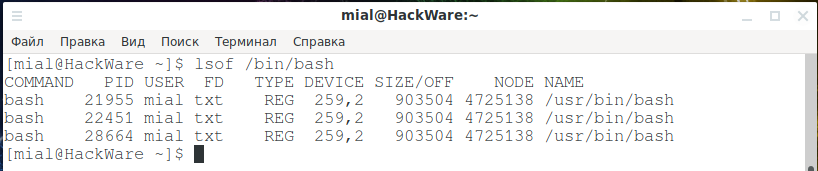 Аналогично можно проверить, открыты (запущены) ли исполнимые файлы, например, для проверки, запущен ли файл /bin/bash: