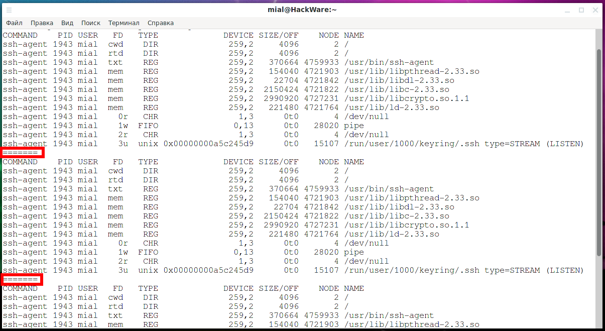 Использование опции повтора в любом формате заставляет lsof отображать результаты как обычно, но добавляет пунктирную линию внизу экрана. Программа ожидает количество секунд, указанное в командной строке, а затем обновляет дисплей новым набором результатов.