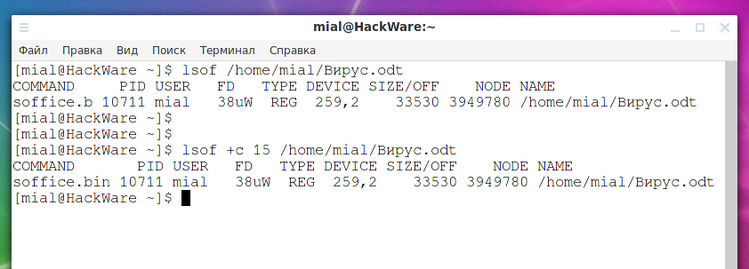 Видно, что файл открыт пользователем mial, это обычный файл (REG) и что он открыт приложением soffice.b (на самом деле приложение soffice.bin, но его имя здесь не целиком).