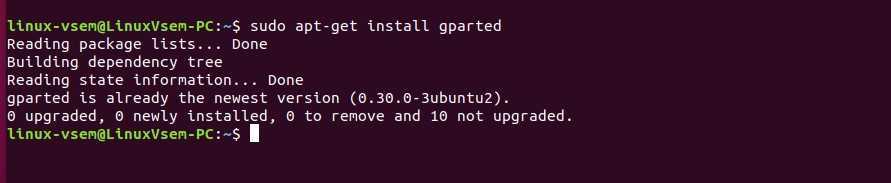 В Ubuntu или Debian введите sudo apt install gparted, а в дистрибутивах, основанных на Red Hat — sudo yum install gparted. Это команды для добавления программы в систему.