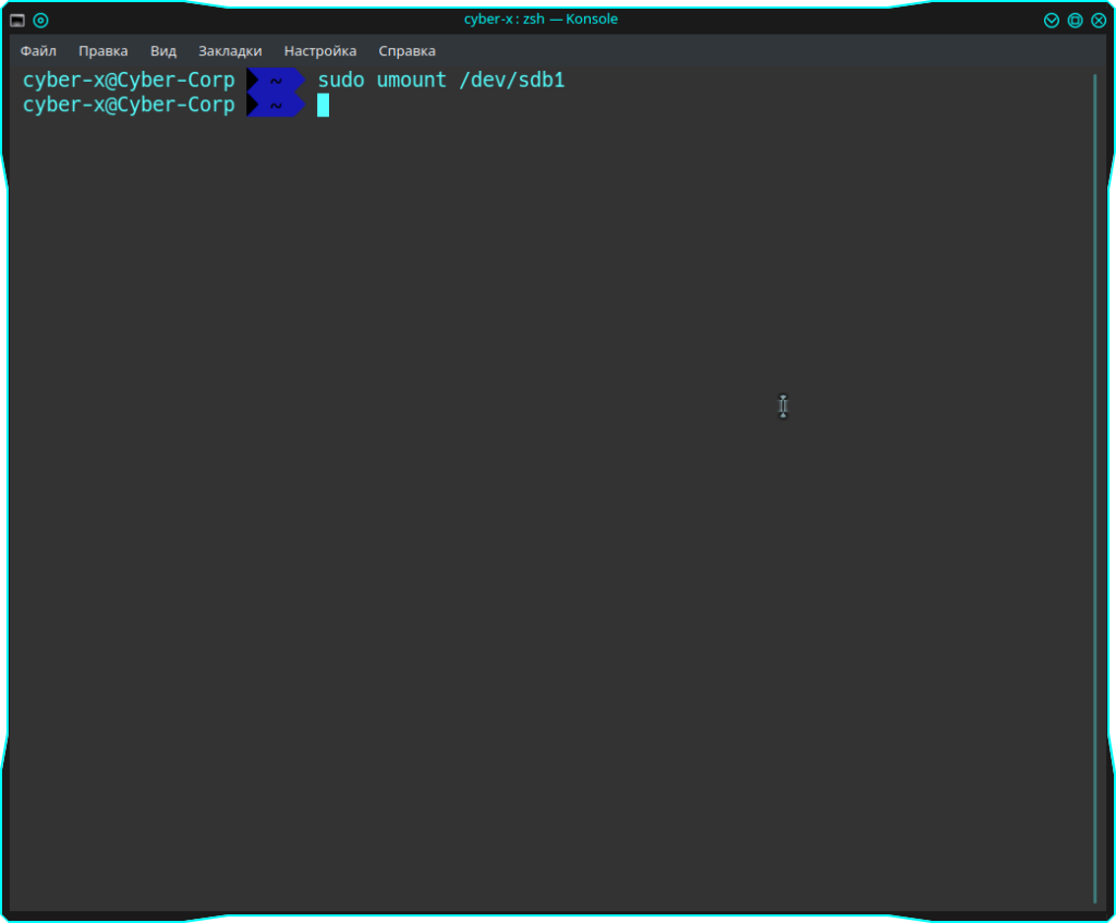 Как можно увидеть из примера, у меня флешка отобразилась как устройство “/dev/sdb”. Определил я ее по размеру и названию. Теперь нам нужно отмонтировать данное устройство. Далее выполняем команду umount и вставляем название нашего устройства которое отображено в строке “Устр-во”, в моем случае это”sdb1″: