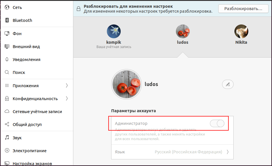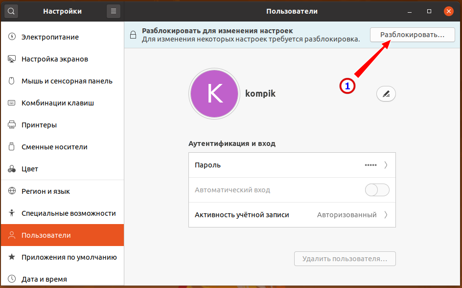 Откройте настройки системы, перейдите в раздел «Пользователи» и нажмите «Разблокировать»,