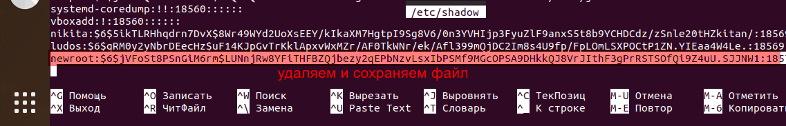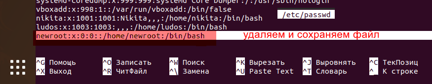 Сначала открываем в редакторе nano файл /etc/passwd и удаляем из него запись о юзере newroot.