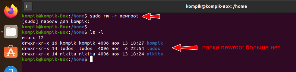 для чего в открываем терминал в папке /home и сносим его командой sudo rm -r newroot.