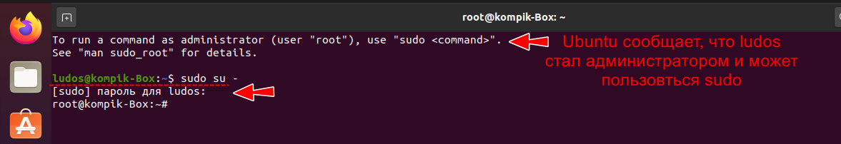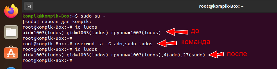 Получив данные о пользователе командой id ludos, мы видим, что его ID и GID остались прежними, зато он оказался членом групп adm и sudo.