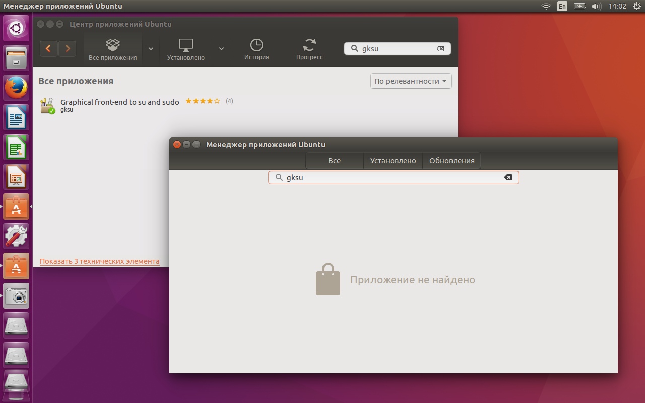 Оказывается, они показывают пользователю разные приложения: Центр приложений знает gksu, а Менеджер приложений — нет!