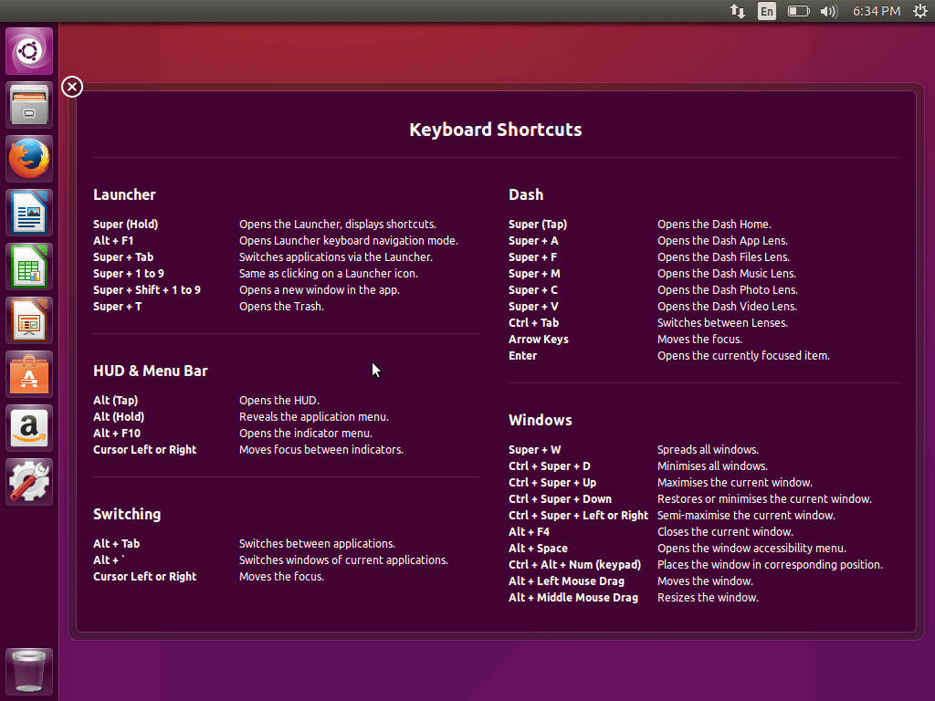Вообще, все основные горячие клавиши Ubuntu можно посмотреть при первом запуске Ubuntu. Система выдаст вот такое окно, в котором все подробно расписано: