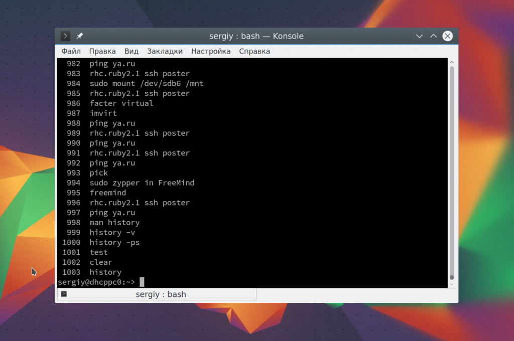 Таким образом, вы можете очень быстро отыскать нужную команду, если помните как она была написана. История команд bash хранит очень много команд и этого вполне достаточно для комфортной работы.