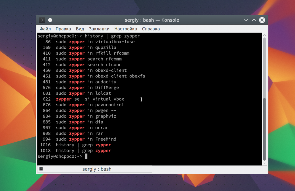 Если вы хотите выполнить поиск по истории bash, можно использовать фильтр grep. Например, найдем все команды zypper: