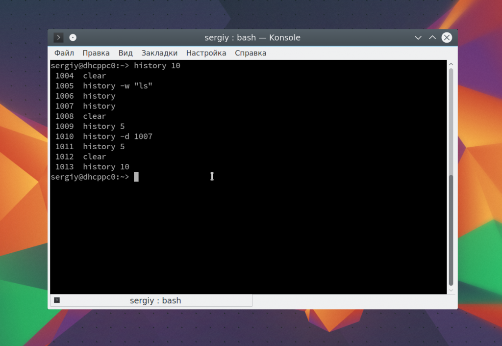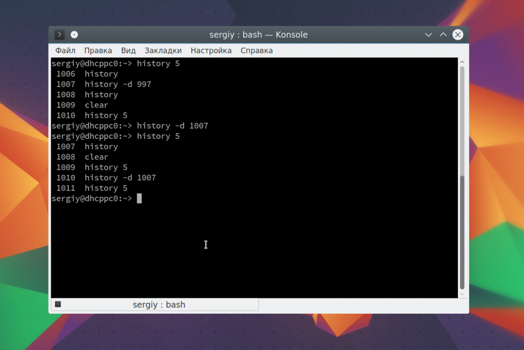 Но для правильной работы такой команды нужна уловка. В файл истории нужно сразу добавить «history –a», затем очистить текущую историю данной сессии с помощью «history –c», после этого прочесть отредактированный файл истории и вернуться в историю данной сессии с помощью «history –r».