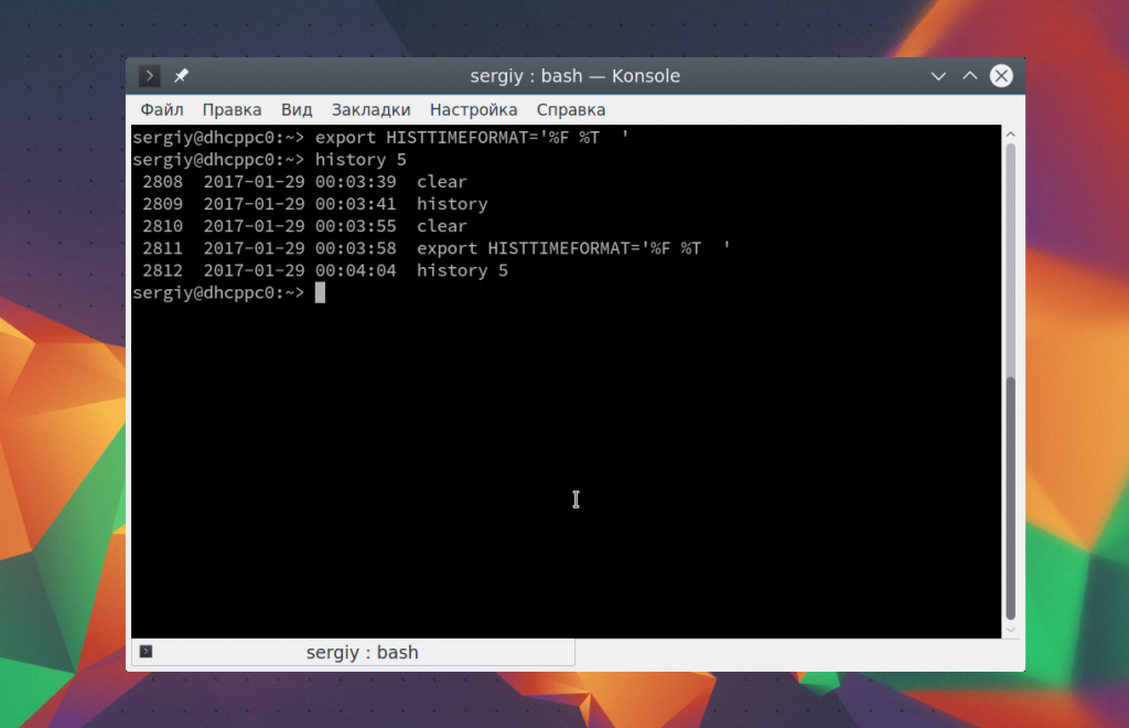 Linux — очень настраиваемая и гибкая система, поэтому настроить здесь можно все, в том числе и историю. По умолчанию выводится только номер команды, но вы можете выводить и ее дату. Для этого нужно экспортировать переменную HISTORYFORMAT вместе нужным форматом: