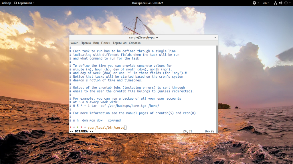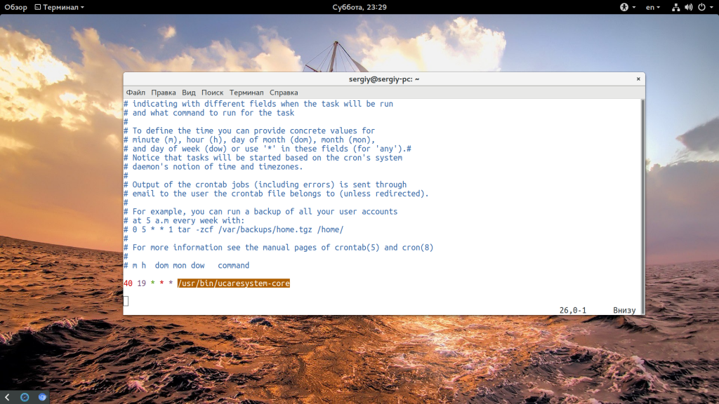 Давайте добавим эту строку в crontabs используя следующие команды.