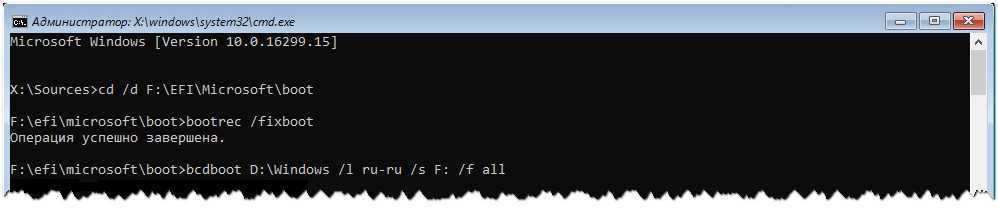 cd /d F:\EFI\Microsoft\boot bootrec /fixboot bcdboot D:\Windows /l ru-ru /s F: /f all
