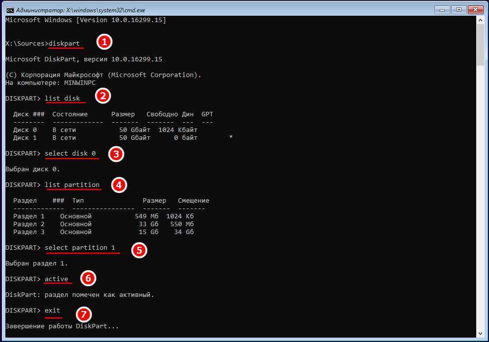 Сделать том «Зарезервировано системой» активным проще всего с помощью загрузочных LiveCD с менеджерами дисков, но сгодится и обычный установочный диск с Windows. Загрузив с него компьютер и открыв нажатием Shift + F10 командную строку, последовательно выполните в ней указанные на скриншоте команды: