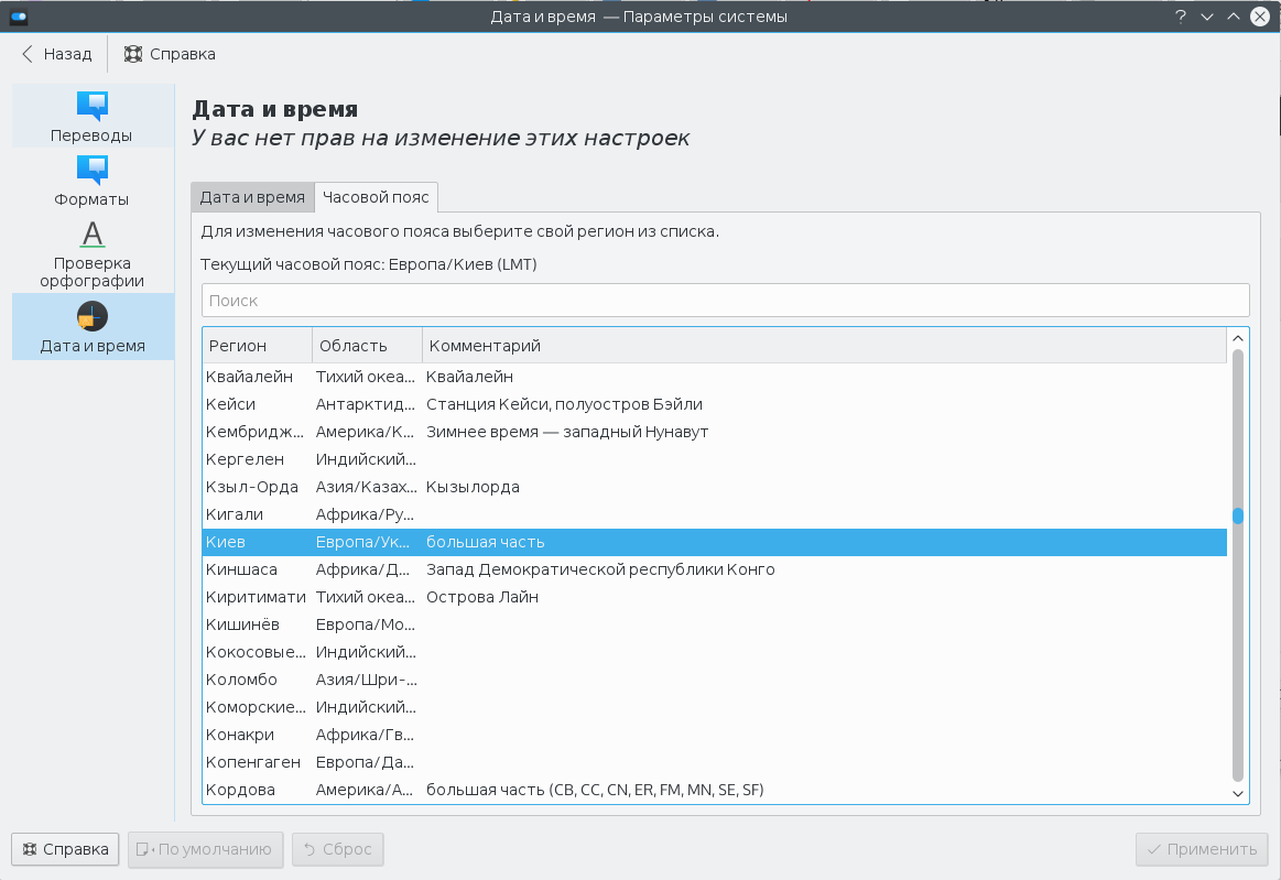 В KDE аналогично можно установить часовой пояс в настройках системы. Запустите утилиту настроек, откройте пункт Локализация, перейдите в раздел Дата и время, а затем откройте вкладку Часовой пояс: